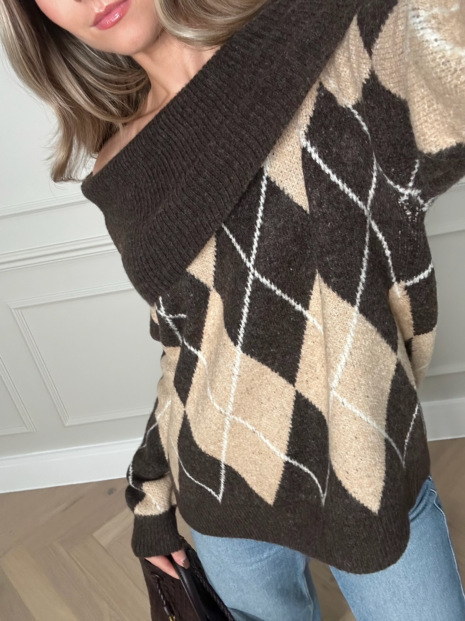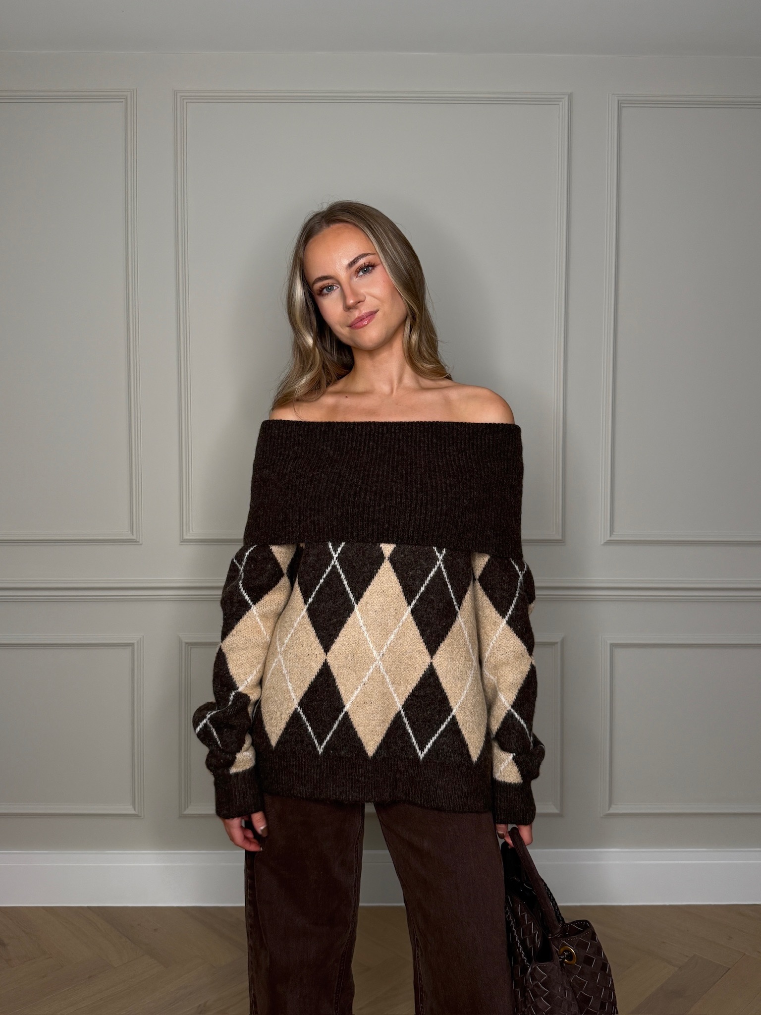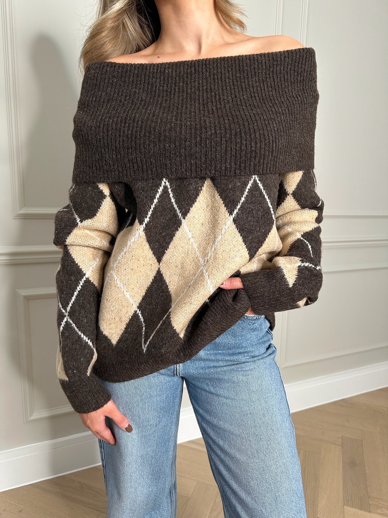 Ava Argyle Pattern Off Shoulder Jumper – Brown