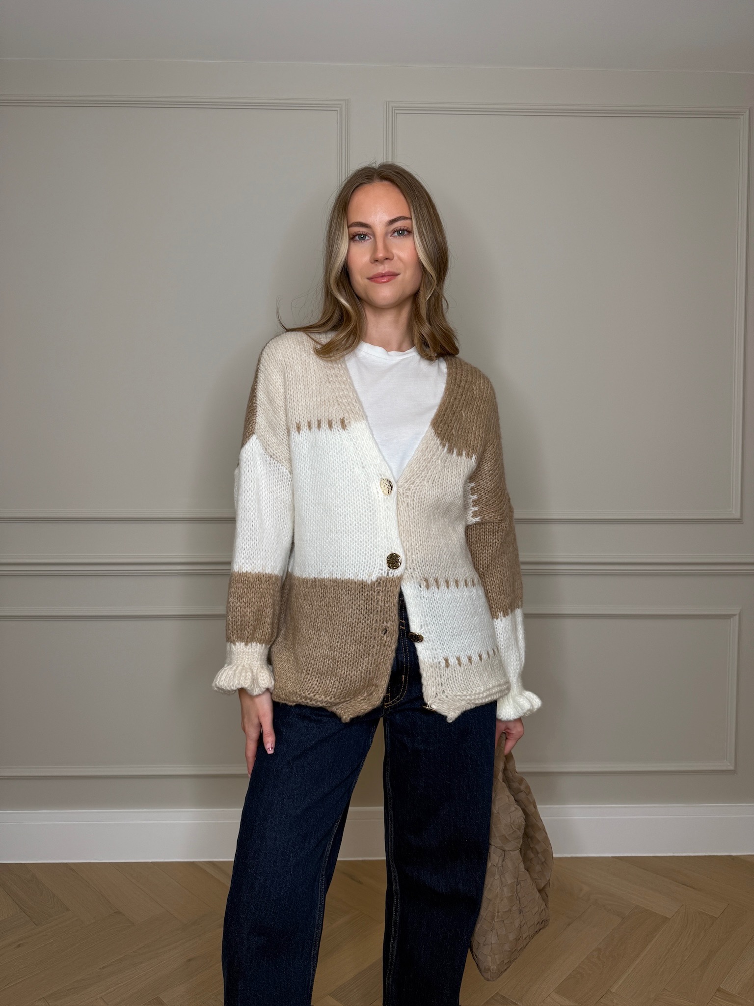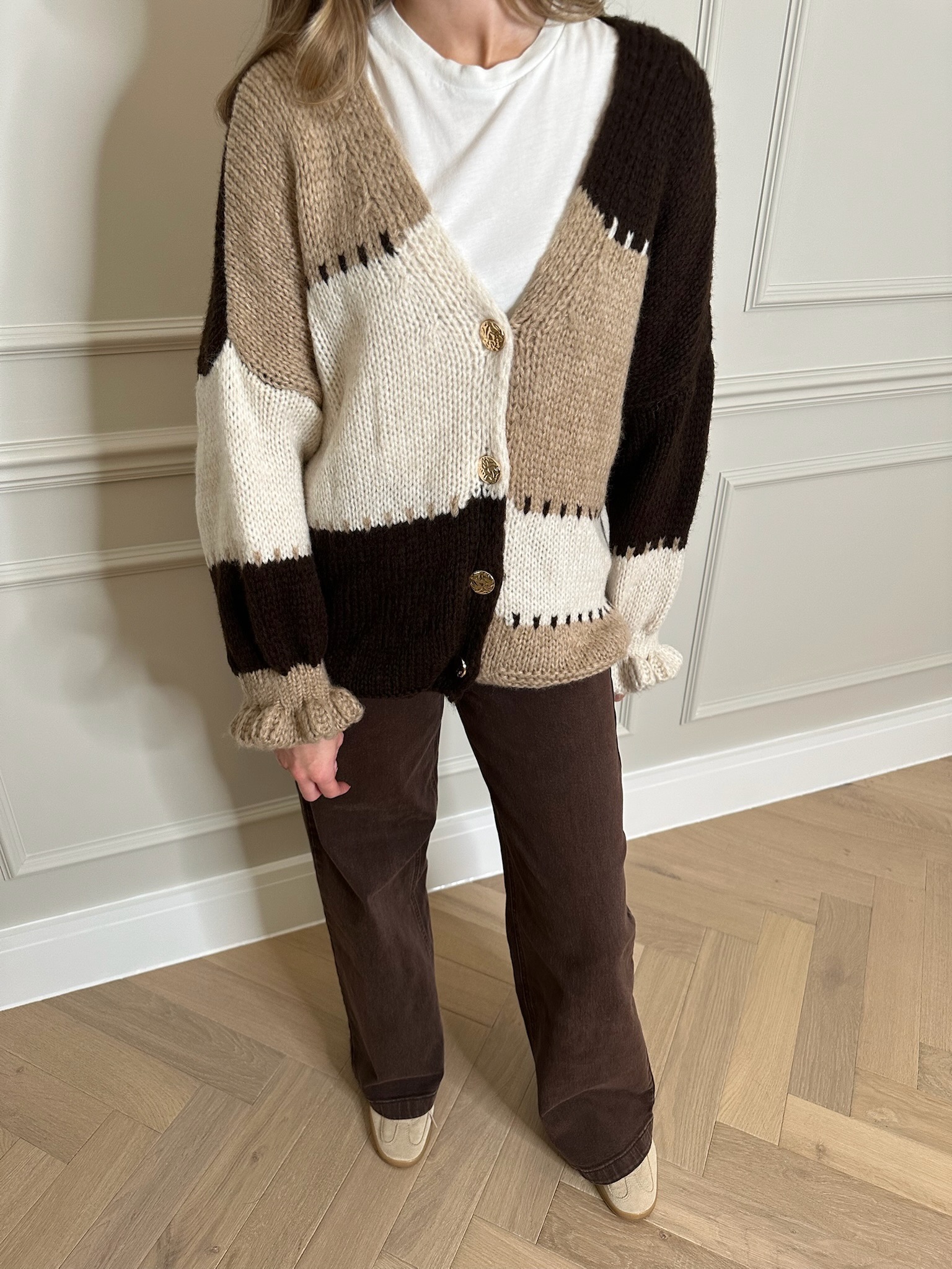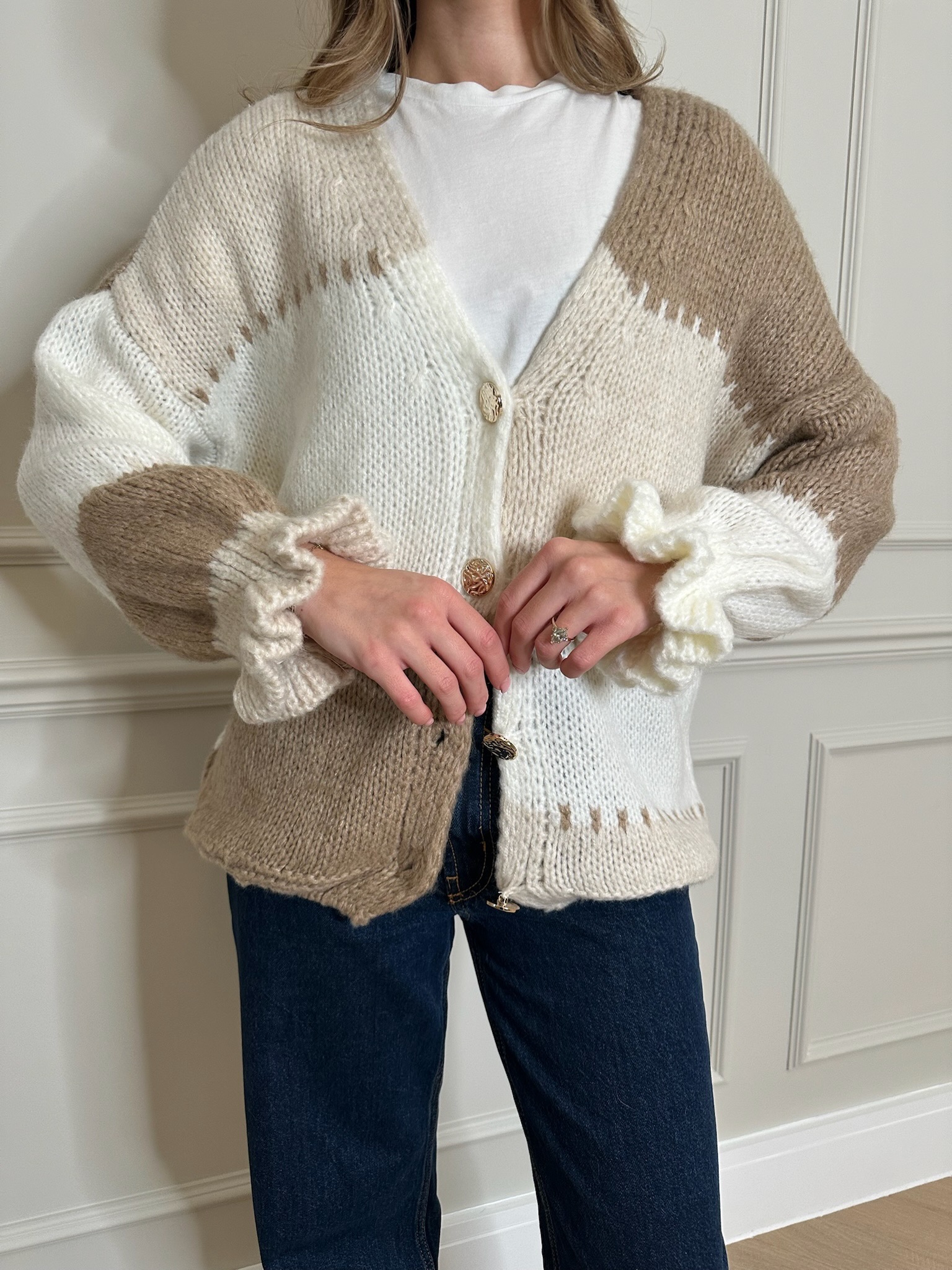 Chunky Colour Knitted Block Frill Sleeve Cardigan with Gold Buttons