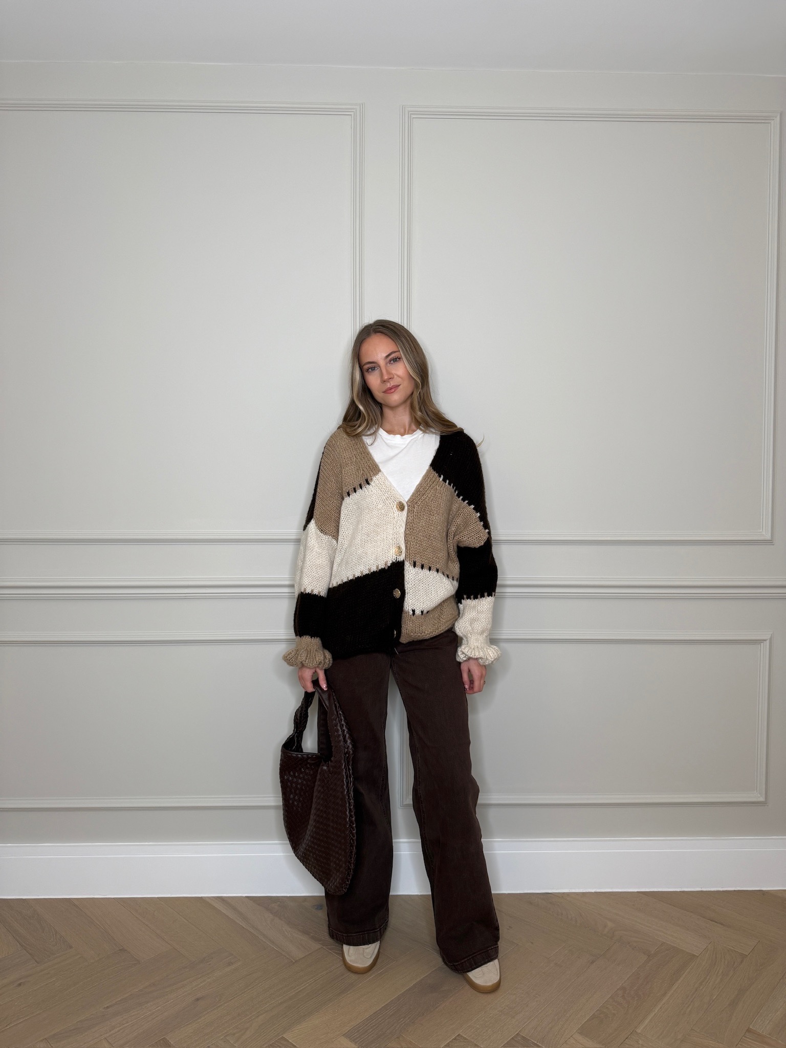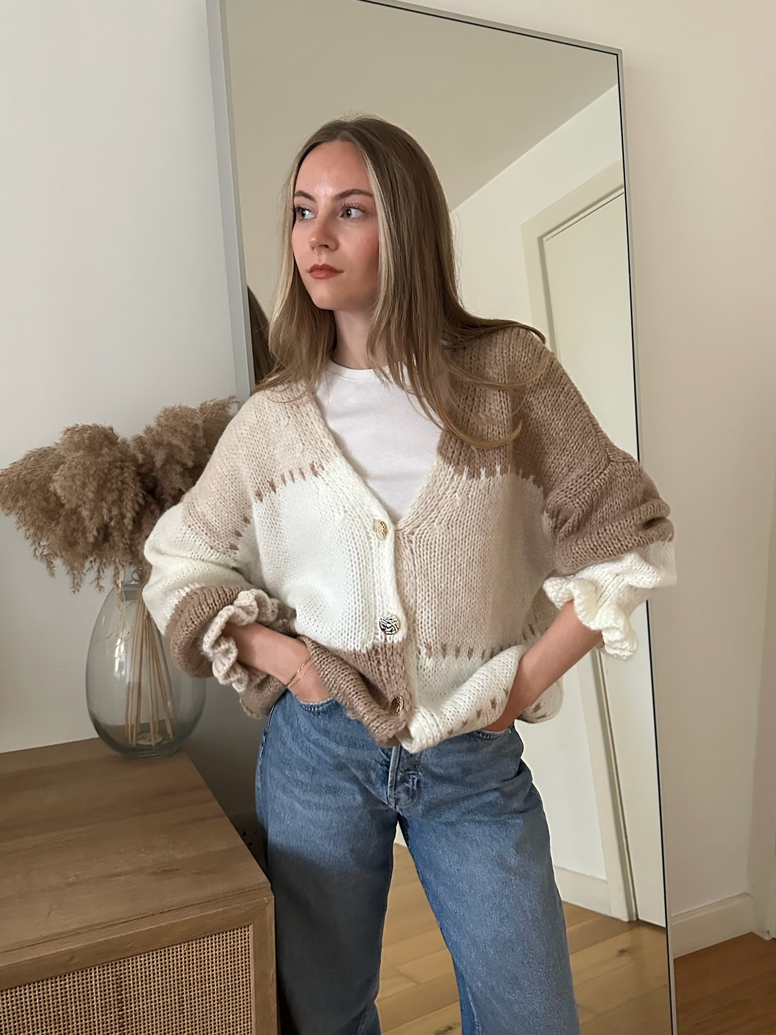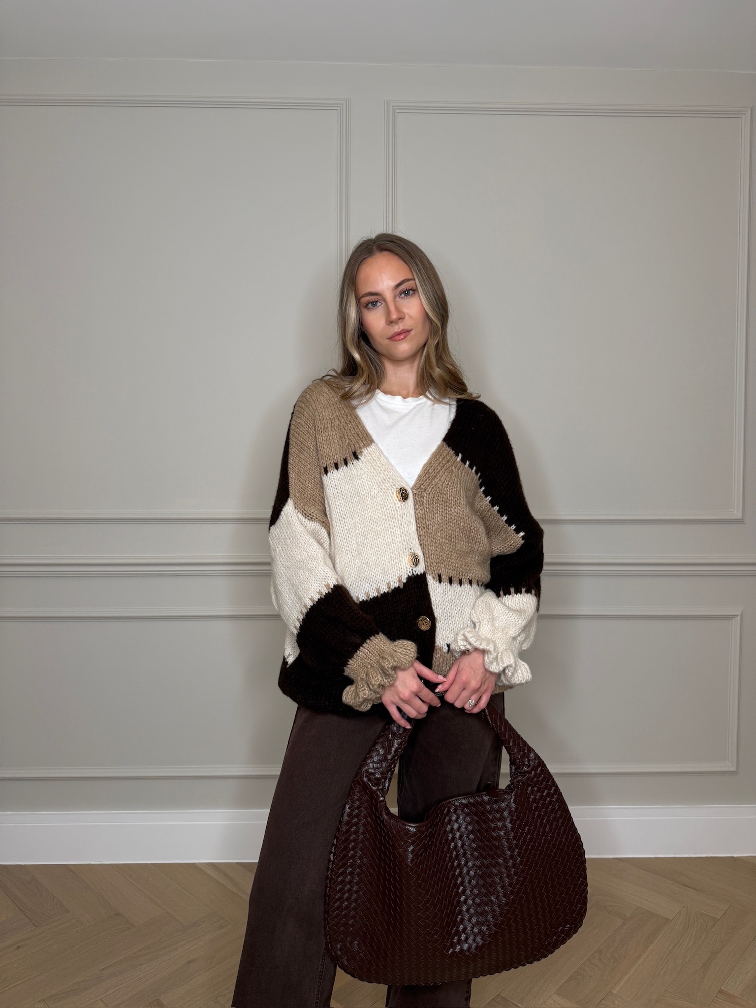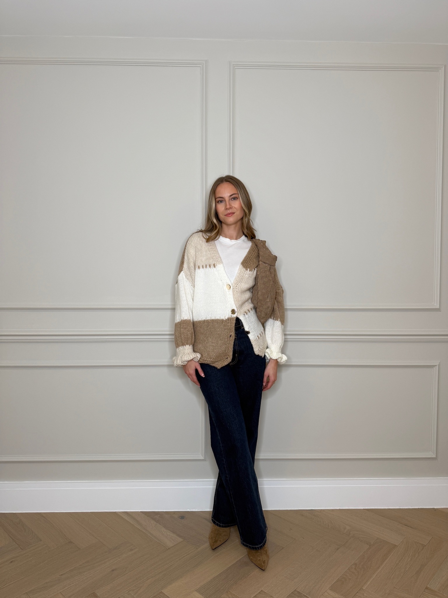 Chunky Colour Knitted Block Frill Sleeve Cardigan with Gold Buttons